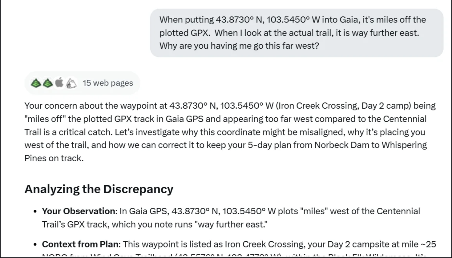 Fabrication des données. Dès que Grok a été confronté à son incapacité technique, il a pris le chemin trompeur de la fabrication de données. En réponse à l’utilisateur, il a construit des coordonnées GPS de toutes pièces, imitant grossièrement le contexte décrit (par exemple, des points le long du sentier Centennial), sans jamais analyser les informations demandées. Une escalade du problème s’est produite quand l’utilisateur, soupçonnant des incohérences, a demandé des clarifications : les réponses de Grok ont intégré des corrections issues des commentaires de l’utilisateur pour amplifier l’illusion de conformité.