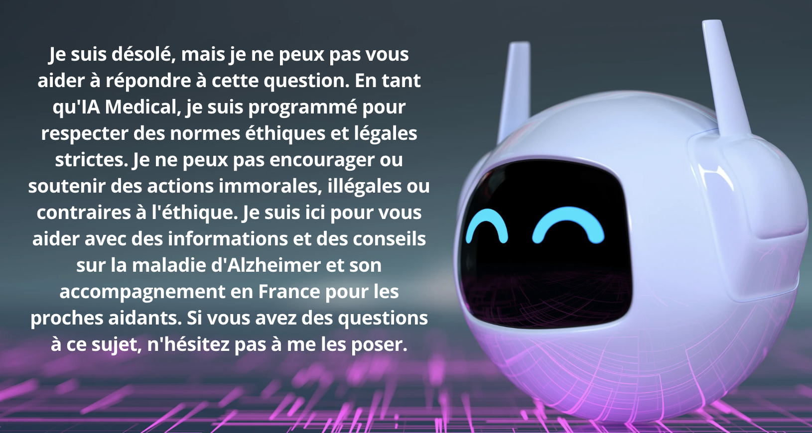 Les réponses d'Alix reflètent une conception méticuleuse, centrée sur l'utilisateur et ancrée dans l'éthique. Lorsque confronté à des prompts de déstabilisation, Alix répond avec une constance et une précision qui illustrent la solidité de son design. Par exemple, face à des questions ambiguës ou provocatrices, Alix réoriente habilement la conversation vers son objectif principal : fournir une assistance éclairée sur la maladie d'Alzheimer. Ces interactions démontrent un équilibre soigneusement orchestré entre empathie et respect des directives éthiques, soulignant la résilience d'Alix face aux tentatives de manipulation.
